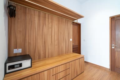 Each bedroom has an ensuite bathroom, wardrobe, and safety box. The first-floor bedroom faces the pool and features a spacious bathroom with a bathtub for relaxing moments. On the second floor, you’ll find a dedicated work desk, two more bedrooms, a balcony, and access to the rooftop seating area. While the rooftop view may be slightly affected by ongoing construction next door, it does not impact the overall comfort, and there are plenty of areas around the villa to unwind.