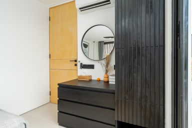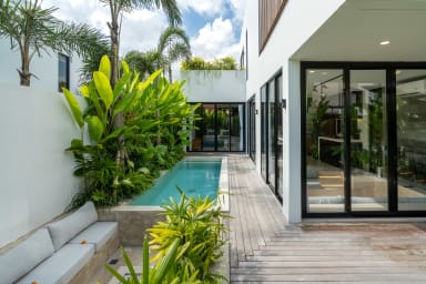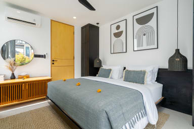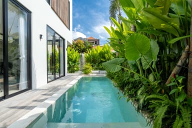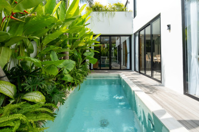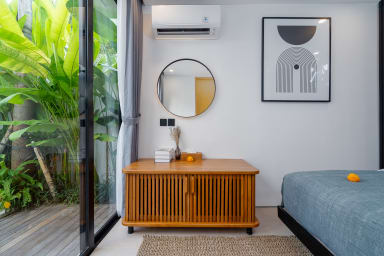 Villa Sapta, completed in 2025, showcases fresh, contemporary design and stylish comfort tailored to leave a lasting impression. Upon arrival, you’re greeted by a refreshing private pool right at the front entrance, setting the perfect tone for a relaxing getaway. Step into the fully enclosed living area, where air conditioning provides a cool sanctuary from Bali’s tropical heat. The space is tastefully styled with modern finishes, ideal for both relaxation and entertaining.