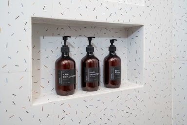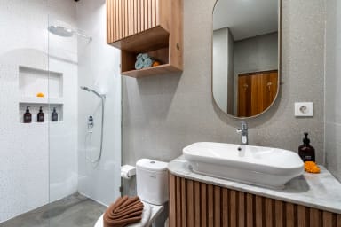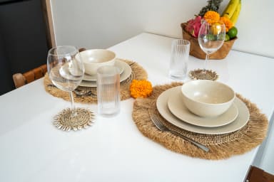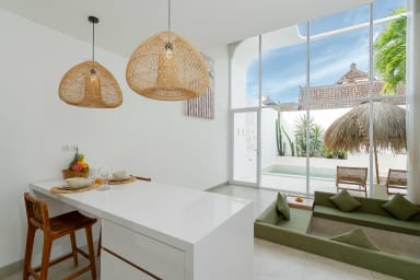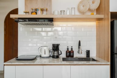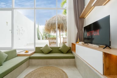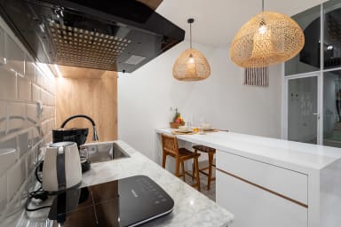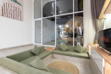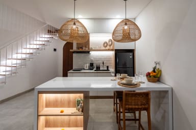 After passing through the beautiful entrance door of the property, you'll be greeted by the beautiful and stylish living quarters of our villa. The living room with the smart TV was beautifully designed and provides a comfortable space to watch your favorite movies or TV shows. The kitchen is fully equipped so you can prepare (or have someone cook for you!) any kind of meals.