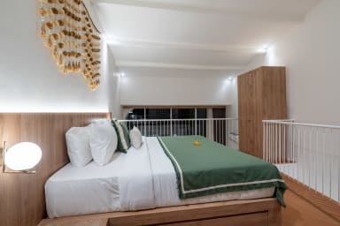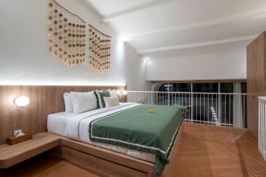 Take the stairs and you'll reach the mezzanine part of the villa and its comfortable bedroom with the king sized bed and small closet, and its attached bathroom.