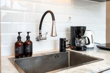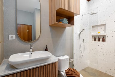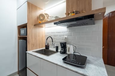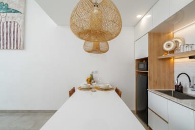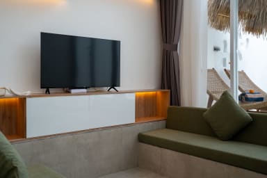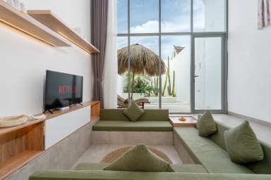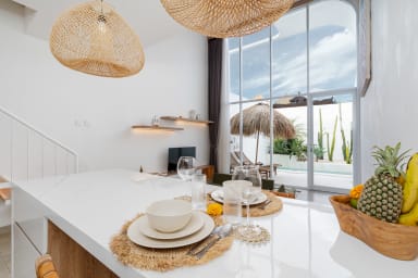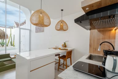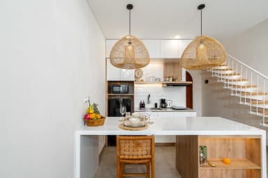 After passing through the beautiful entrance door of the property, you'll be greeted by the beautiful and stylish living quarters of our villa. The living room with the smart TV was beautifully designed and provides a comfortable space to watch your favorite movies or TV shows. The kitchen is fully equipped so you can prepare (or have someone cook for you!) any kind of meals.