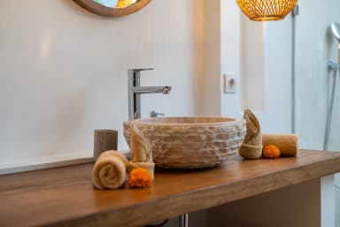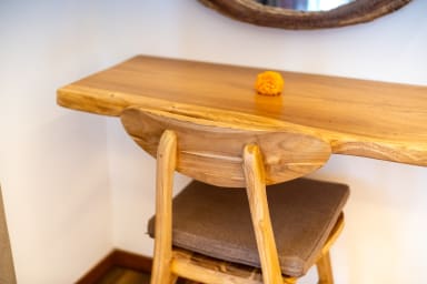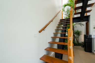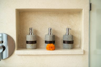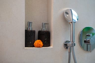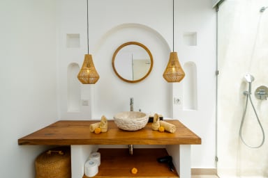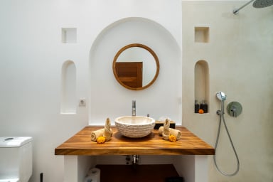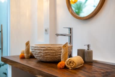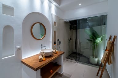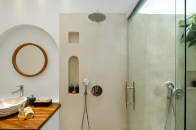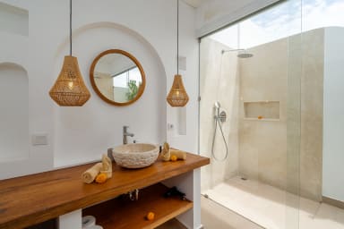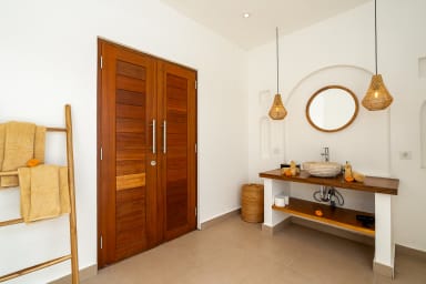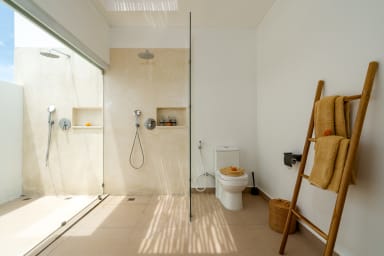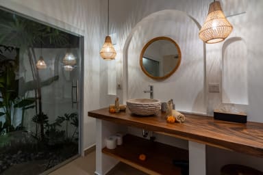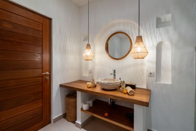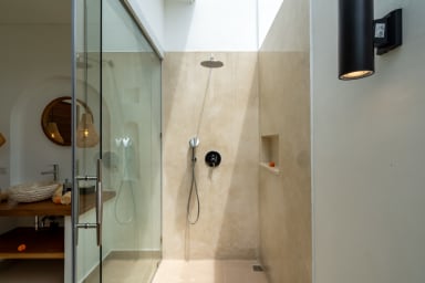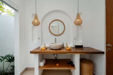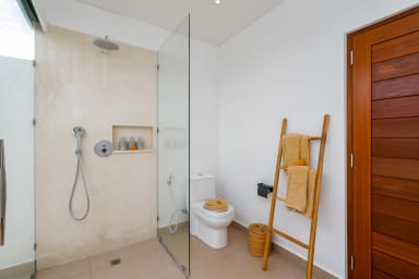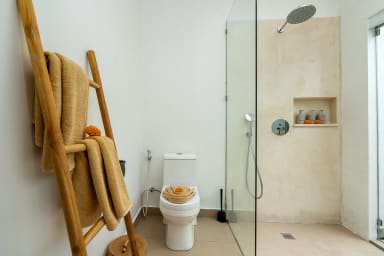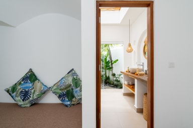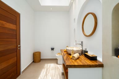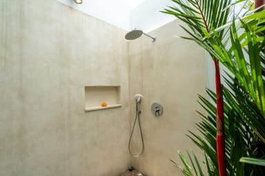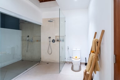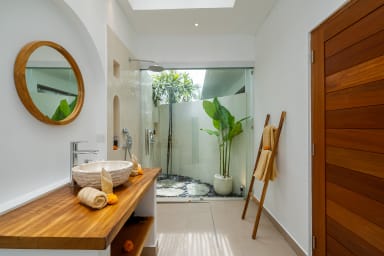 The two ground floor bathrooms embrace a semi open tropical concept that allows natural light and fresh air to flow naturally through the space. A small lush garden sits in the corner beside the shower area, adding a serene touch. Each of these bathrooms is equipped with both an indoor and an outdoor shower, allowing you to fully enjoy Bali’s tropical living experience in complete privacy.