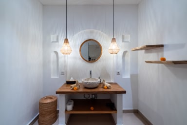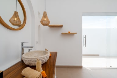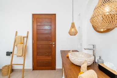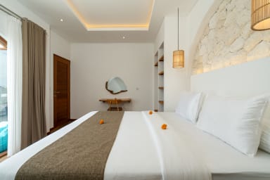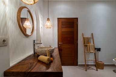 The villa offers four spacious bedrooms, each with its own ensuite bathroom, with two bedrooms located on the ground floor and two on the second floor. Every bedroom is furnished with a king size bed measuring 180 x 200 cm, air conditioning, and a wardrobe, providing a comfortable and private retreat for every guest.