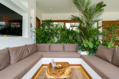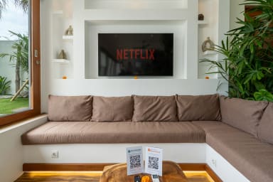 The living room features a stylish sunken sofa facing a large smart TV with Netflix access. Guests simply need to log in to their own account to enjoy their favorite shows and movies, making it a perfect space to unwind after a day exploring Bali.