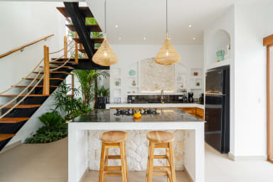 Across the indoor garden, just beyond the living area, you will find a welcoming dining space connected to a fully equipped kitchen. Whether you enjoy cooking your own meals or prefer to have someone prepare your favorite dishes for you, this space is designed to make every dining experience comfortable and enjoyable.